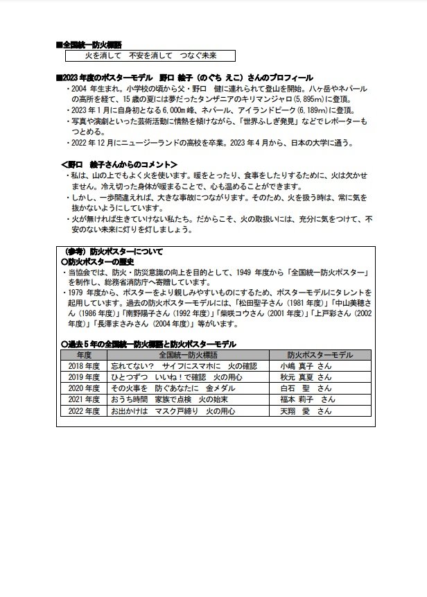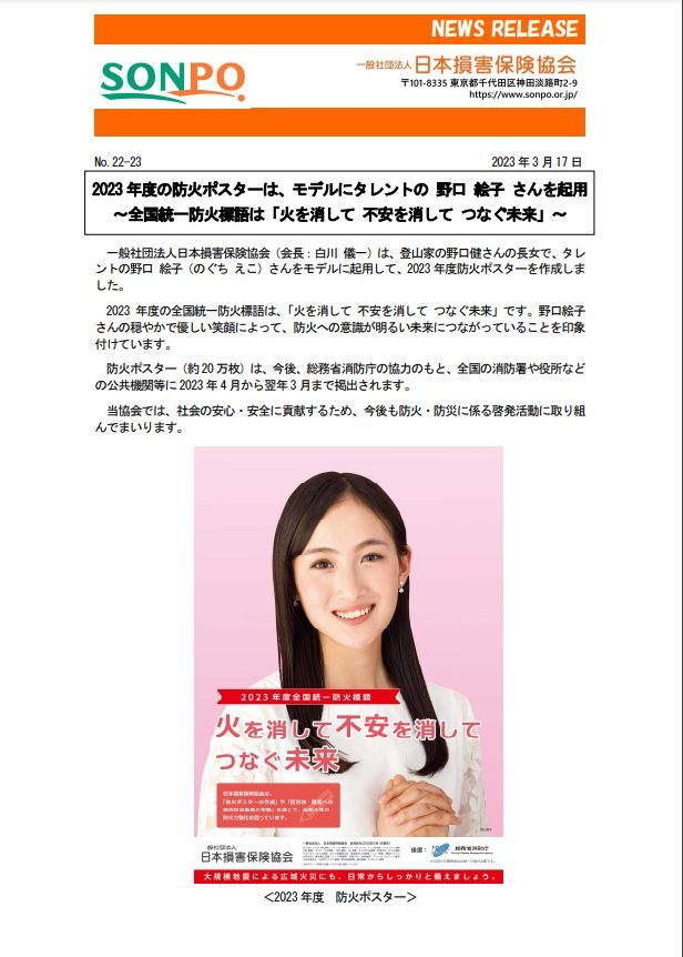 損害保険協会主催の2023年度防火ポスターのモデルに起用されました。